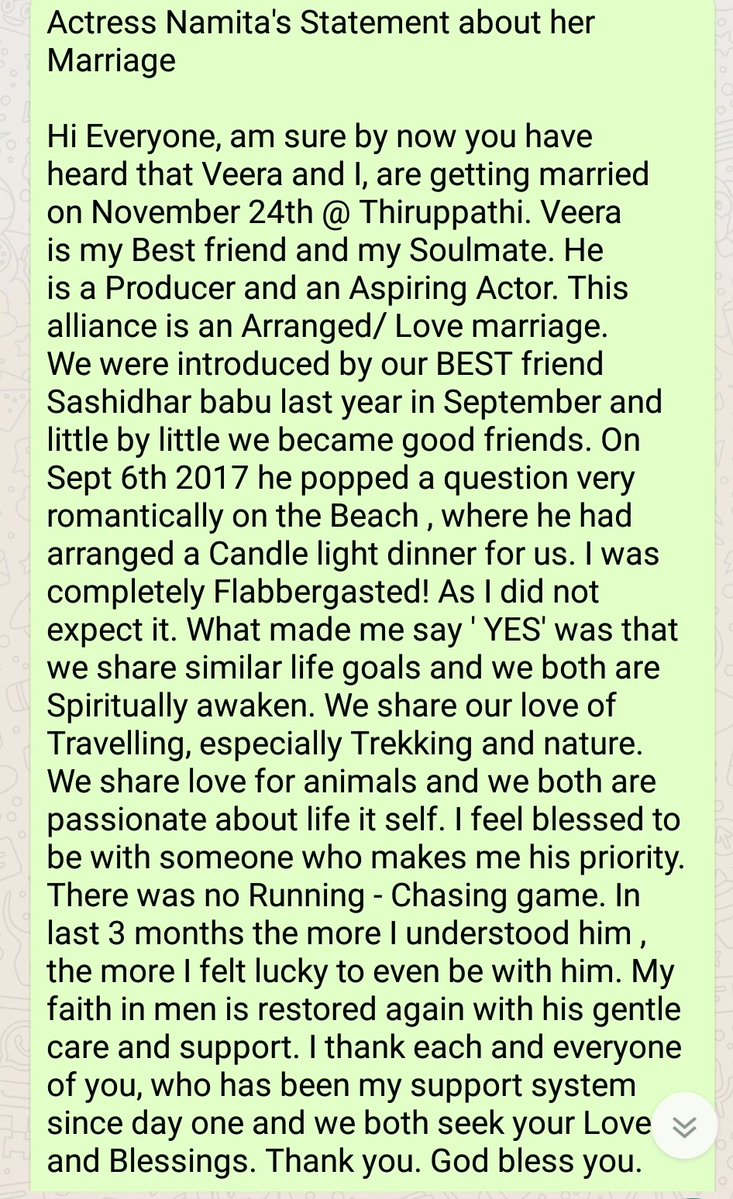 Namita had announced her marriage with Veera by a video coverage that was released by Bigg Boss fame Raiza Wilson this morning. Now the actress had released the statement regarding her marriage that will take place on Nov 24th at Tirupatti. She shared her first meeting with Veera who became friend to her last September.