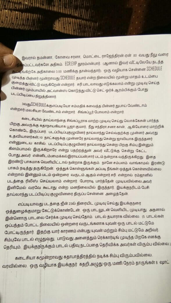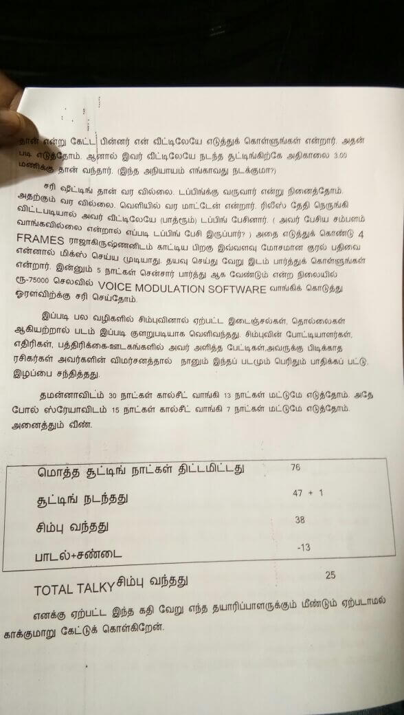 The producer claimed several allegations with the actor. He pointed out the days Simbu worked in the film and days planned for shoot.