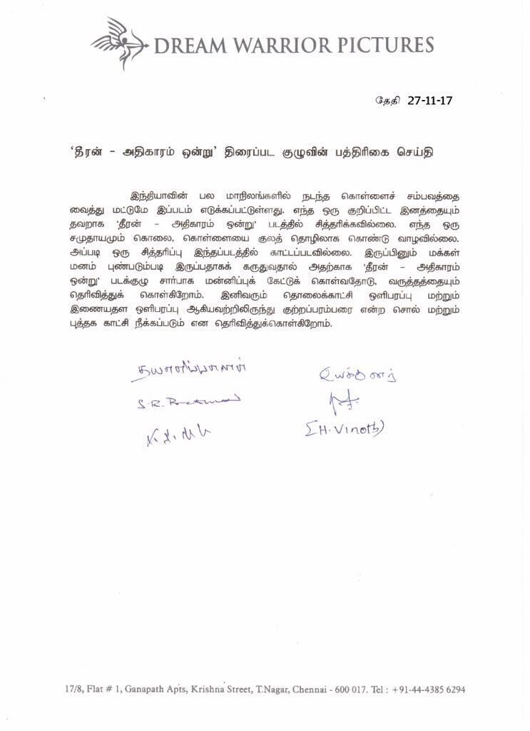 Theeran team had released the press note stating they won't be screening the scenes that hurt some group of people. They stated "Theeran had been created based on the theft and murder happening in various parts of the country. We did not point out any specific caste or group. No society had taken theft as their family business. We did not portray or mention any special community that is doing so. We on behalf of Theeran team, feel extremely sorry and regret to those people who hurt by this film. Television and streaming sites will not have scenes that mention 'Kutraparambarai'. "