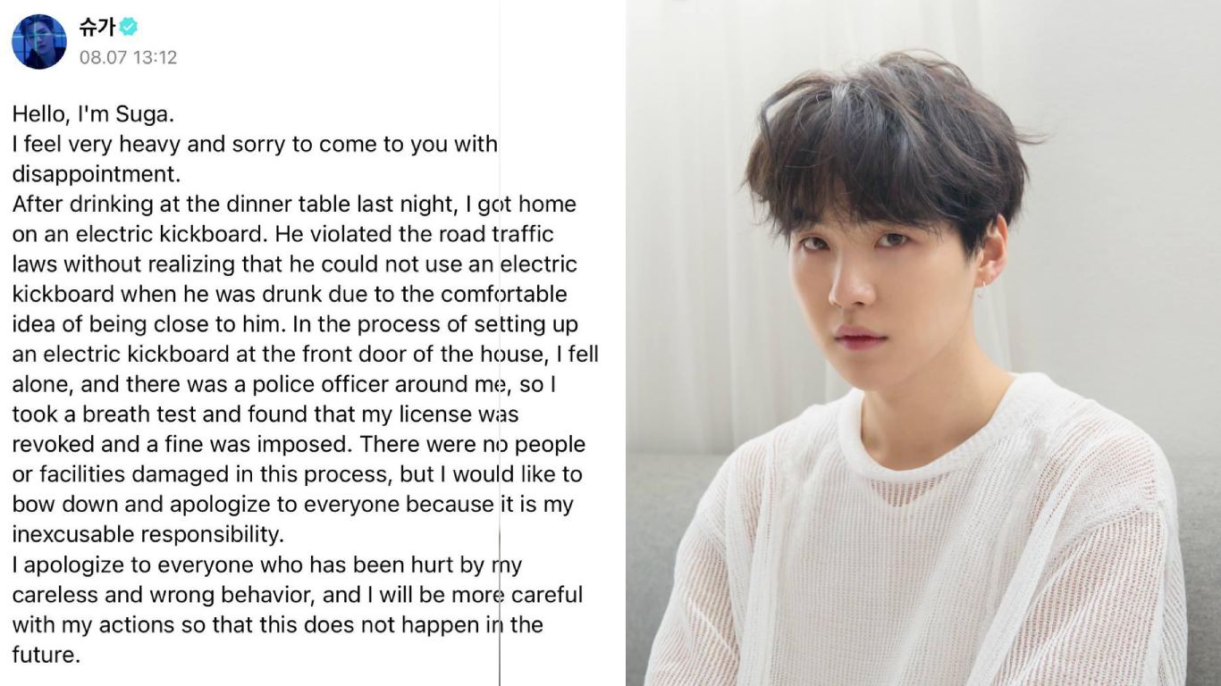 BTS member Suga wrote a public apology following an incident involving drunk driving. Suga, who is currently serving in the South Korean military, revealed that he was returning home late at night on an electric kickboard after consuming alcohol.