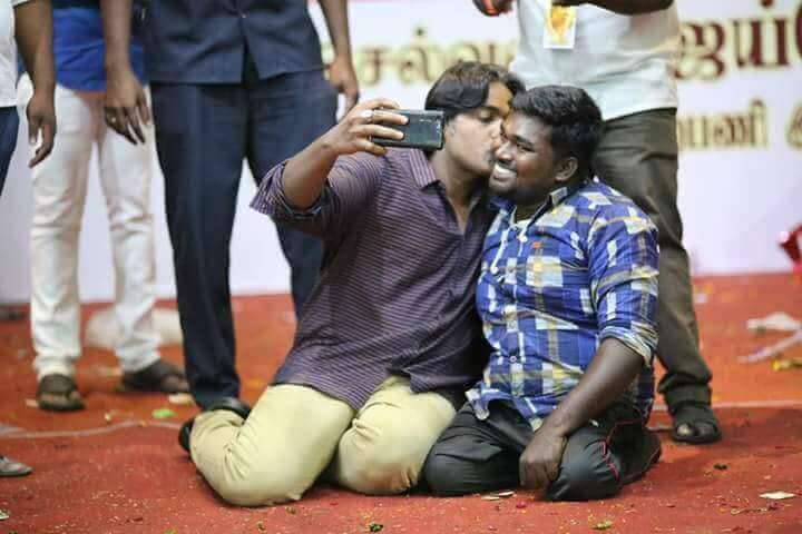 The humble actor Makkal Selvan Vijay Sethupathi during his fans meet today had selfie with fans. His gesture had shocked and excited everybody gathered their. His fans were happy about his action. Makkal Selvan had selfie with fans with kissing pose. He kissed every of his fans and took stills with them.