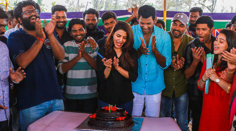 The team celebrated the wrap up by cutting cakes. Samantha, Vishal and all team members enjoyed the day. The 4 years of debutante PS Muthiran's hard work has come to the final stage successfully. He is eager for the movie release with confidence. The lead actors are more confident about the script and outcome of it.