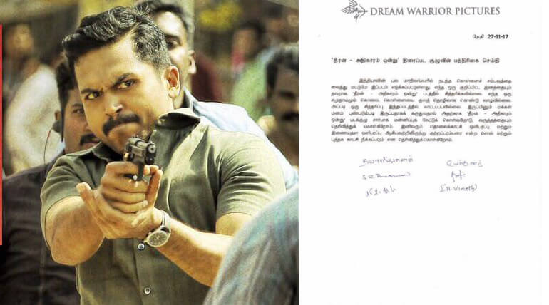 Theeran Team Press Release: Television and Streaming Sites will not have scenes that mention 'Kutraparambarai'