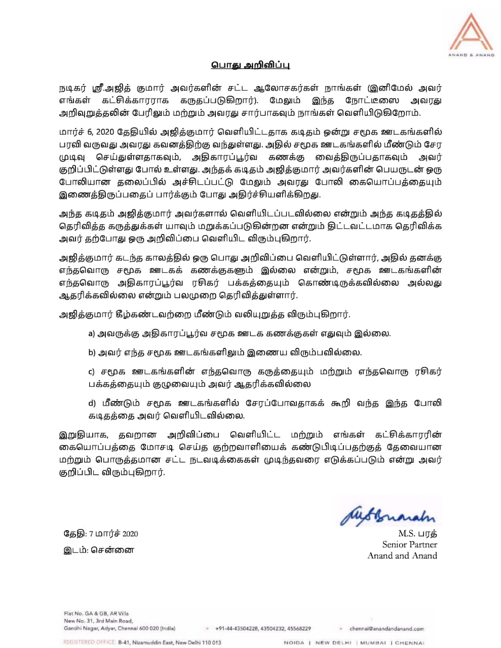Ajith denies rumors of him to be active in the social media: Actor Ajith Kumar today, March 7, has denied the fake letter circulating from yesterday in the social media in his name. The letter was written in his forged letterhead and signature. It states that he is to again be active in social media. In a strongly worded public notice, his advocates from the law firm Anand and Anand has categorically denied such a letter from Ajith. They have also confirmed that he is not going to be part of any social media platform. Also, they informed that all possible legal action to be taken against those who were responsible for circulating such a fake letter in social media.