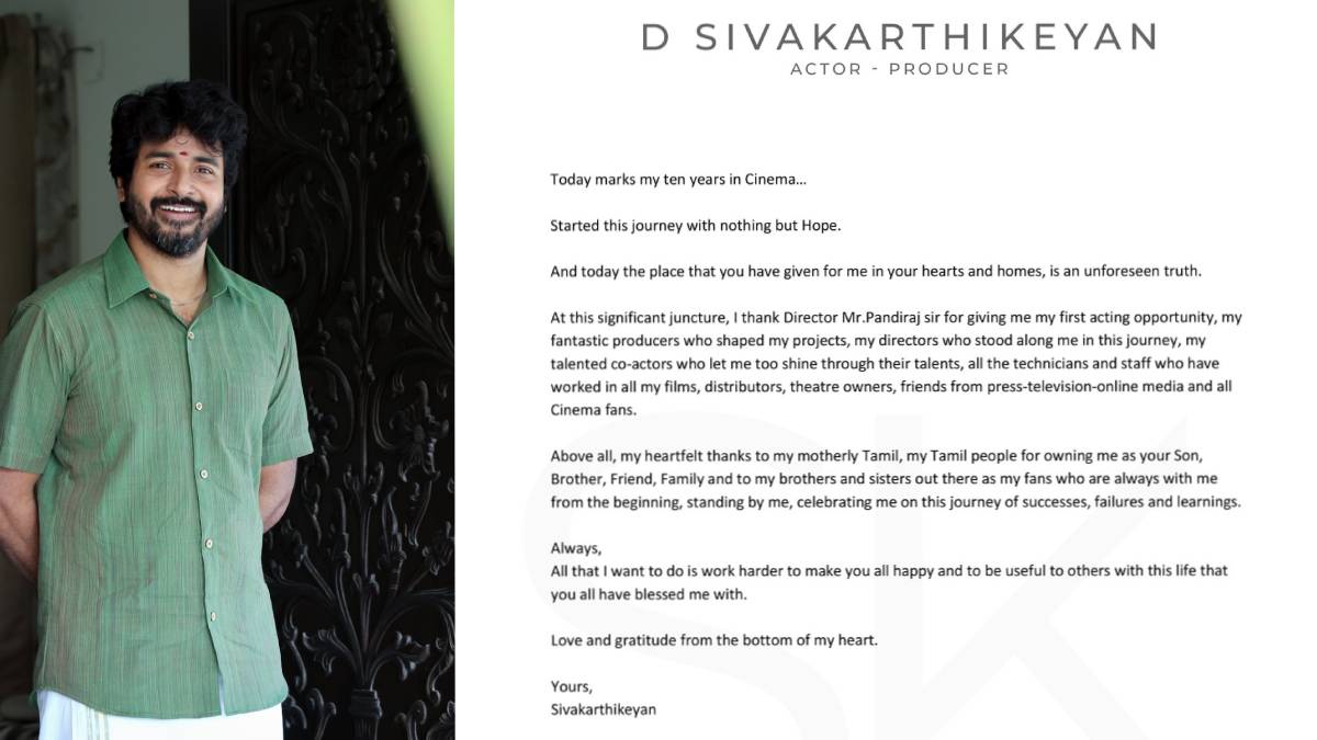 Actor Sivakarthikeyan made his acting debut in the film Marina, directed by Pandiraj and released on February 3, 2012. Sivakarthikeyan, who entered the film industry at this stage, has completed ten years today and has written a heartfelt letter in this regard. The emotional note has touched the hearts of his fans.